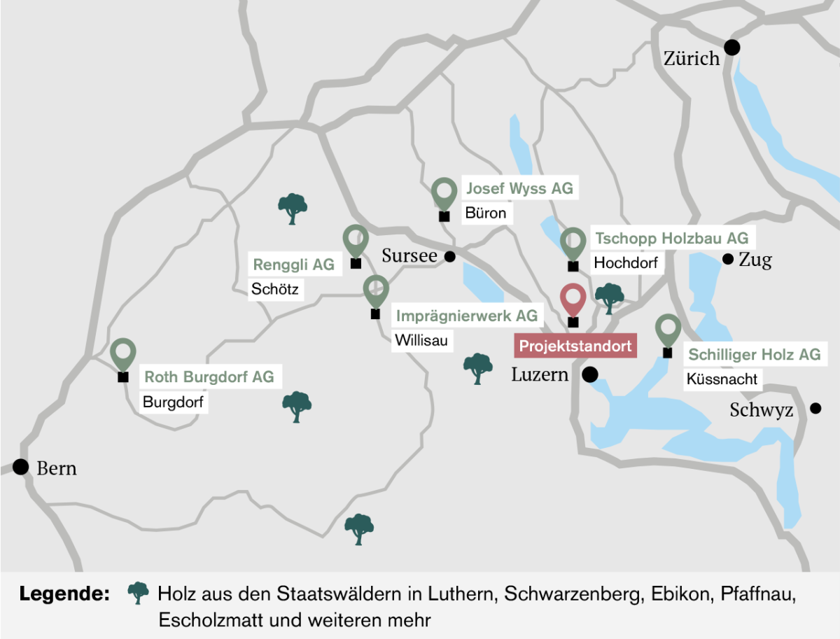 Bevor Renggli Hand anlegt, wird das Holz in insgesamt 12 Staatswaldgebieten geschlagen und zum Sägewerk Josef Wyss AG in Büron transportiert. Die Vollholzbretter werden anschliessend bei der Schilliger Holz AG in Küssnacht zu Konstruktionsholz und bei der Roth Burgdorf AG in Burgdorf zum Holztragwerk und zu Brettschichtholz verarbeitet, während das Imprägnierwerk AG in Willisau daraus die Fassadenschalungen herstellt. Die Tschopp Holzbau AG in Hochdorf fertigt die Massivholzdecken und liefern sie zuhanden Renggli direkt auf die Baustelle.