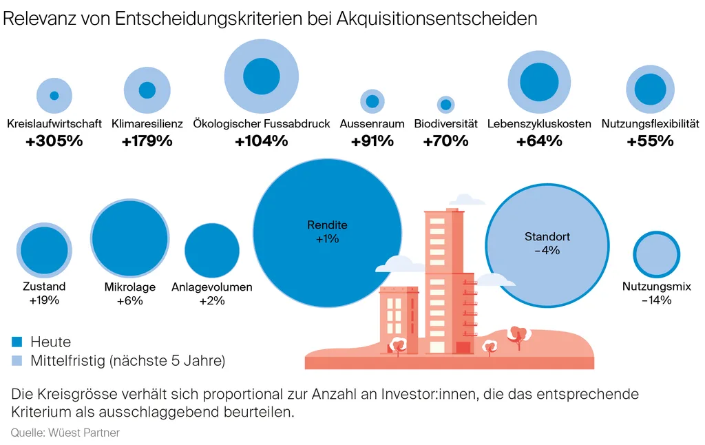 Wüest Partner befragte 2022 bereits zum zweiten Mal mehr als 300 Schweizer Investoren. Dabei gelangten sie zur Erkenntnis, dass die Nachhaltigkeitsspektren bei Neuakquisitionen von Immobilien mittelfristig bei Investoren deutlich an Gewicht gewinnen. Wie aus der Grafik (Abb. 2) ersichtlich, verzeichnen die Themen Kreislaufwirtschaft, Klimaresilienz und ökologischer Fussabdruck mit bis zu 300 % das stärkste Wachstum. Treiber dafür ist vor allem der politische und gesellschaftliche Druck auf das Erreichen des Netto-Null-Ziels bis 2050. Besonders nachhaltige Immobilien können in einer Transaktion heute mit einem Preisaufschlag rechnen, was vor allem auf das niedrige Angebot zurückzuführen ist. Künftig wird sich dies in einen Preisabschlag für nicht nachhaltige Immobilien umwandeln (Stammberger & Selberherr, 2023).