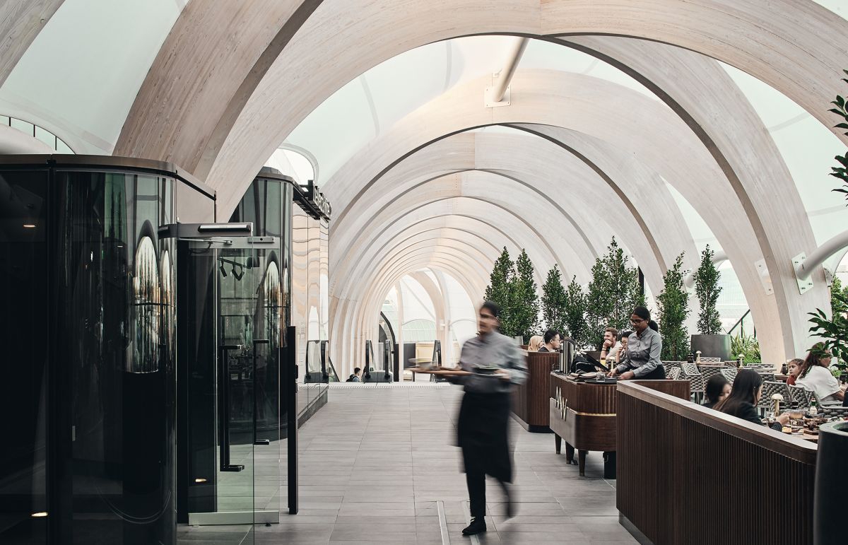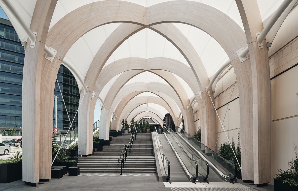 Der sogenannte Chadstone Link gehört zum grössten Shoppingcenter der Südhalbkugel. Er besteht aus 31 Brettschichtholzbögen, die transluzent mit PTFE-Stoff überzogen sind. Die zwischen 3 und 15 Meter hohen Bögen bilden insgesamt 14 tragende Gewölbe, die Platz für Rolltreppen, Cafés, ja sogar Ausstellungen und Veranstaltungen bieten. Aber allein schon das Durchschreiten dieser 110 Meter langen, lichtdurchfluteten Passage, gesäumt von quaderförmigen Töpfen mit Grünpflanzen, hat etwas Sakrales. Die Diagrid-Struktur der über Kreuz angelegten Brettschichtbögen widerspiegelt nicht nur das gewölbte Glasdach des Chaddy, wie das berühmte Einkaufscenter von den Einwohnern gerne genannt wird. Sie erinnert in der Tat auch an ein gotisches Kirchenschiff. Hier kann man dafür beten, dass überall auf der Welt vermeintlich banale Projekte wie Fussgängerpassagen nicht bloss als logistische Notwendigkeit, sondern vermehrt als kreative Chance gesehen werden.