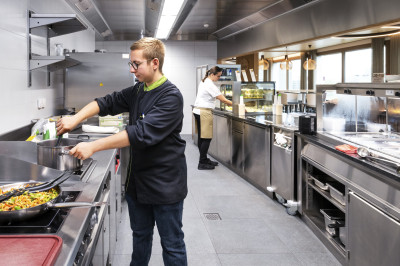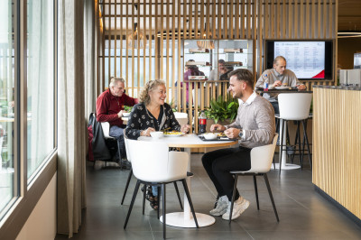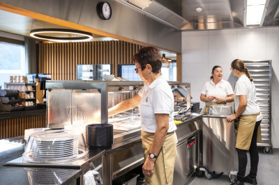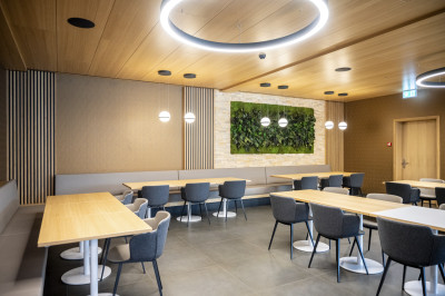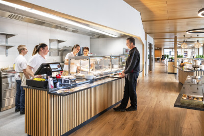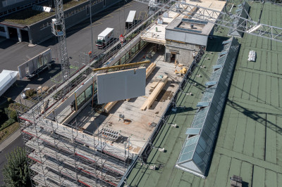 Der Bürotrakt eines bestehenden Logistikcenter-Gebäude der europaweit tätigen Galliker Transport AG wurde aufgestockt. Die erweiterte Fläche bietet so Platz für zwei Terrassen, eine 70 m2 grosse Küche und einen Restaurantbereich von 370 m2. Dank des geringen Eigengewichts ist eine Aufstockung mit Holz einfach möglich. Eine Akustikdecke mit integrierten Kühlelementen sorgt zusätzlich für ein angenehmes Raumklima und hohe Behaglichkeit. Aufstockungen mit Holz überzeugen zudem mit einer schnellen und emissionsarmen Bauzeit vor Ort. Die Montage der Holzelemente dauerte nur drei Tage. Nach dem Abschluss des Innenausbaus freuen sich die Galliker-Mitarbeitenden über ein firmeneigenes, modernes Restaurant.