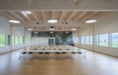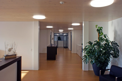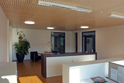 Das viergeschossige Bürogebäude in Holzsystembau trägt die Handschrift der Renggli AG: Vom Entwurf über die Engineering-Leistungen bis zur Montage. Es beinhaltet die Sprinkleranlage der Werkhallen (im Untergeschoss), eine grosszügige Kantine, zwei Bürogeschosse mit Sitzungszimmern und ein Attikageschoss mit einem Medienraum. Dieser verfügt mit 5.40 Meter über eine doppelt so hohe Raumhöhe wie die übrigen Geschosse und kann für bis zu 200 Personen genutzt werden. Für die stimmige Raumakustik sorgt die in unserem Platten-Bearbeitungszentrum (BAZ) realisierte Akustikdecke.