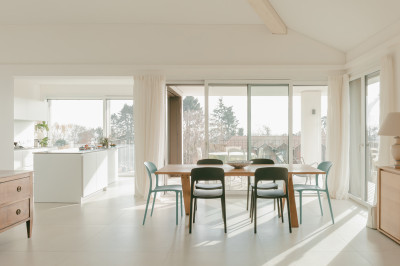 Anders als üblich entschieden sich die Architekten dafür, die Schlafzimmer im Erdgeschoss und die vollständig offenen Wohnräume im ersten Stock anzuordnen, um mehr Freiraum in den Wohnzimmern zu gewinnen und von den Terrassen aus einen Blick auf den Genfersee zu ermöglichen. Die Innentreppen wurden zwischen den beiden Ebenen versetzt, um das Licht von den Dachfenstern durch das ganze Haus bis ins Untergeschoss zu leiten.