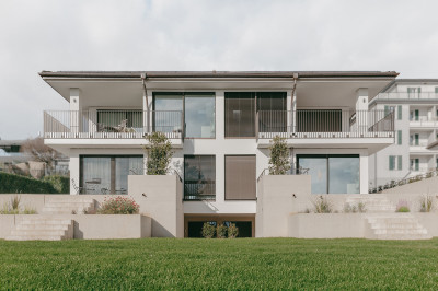 Mit herrlichem Blick über den Genfersee sind zwei Doppelfamilienhäuser in Holzsystembau in St-Prex entstanden.