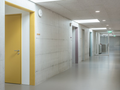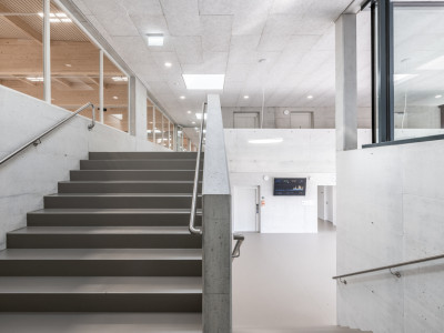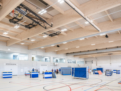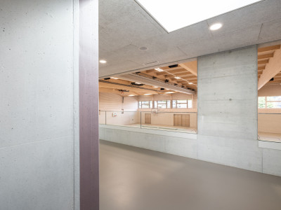 Rund zwei Monate nach Auftragserhalt stimmten im November 2022 die Stimmberechtigten von Oftringen einer zusätzlichen Unterkellerung des Neubaus zu. So entstanden im Untergeschoss der Dreifachsporthalle eine Einstellhalle mit 55 Parkplätzen sowie Räume für die Haustechnik und Lager. Die Turnhalle mit einer Länge von 47 Metern und 9.3 Metern Höhe wurde komplett in Holzsystembauweise erstellt. Der zweigeschossige Garderoben- und Gerätetrakt in konventioneller Bauweise schliesst als «Rucksack» direkt an die Holzhalle an. Blickfang im Halleninneren sind die grossen, verleimten Holzbinder, die das Dach über eine Breite von 27 Metern tragen.