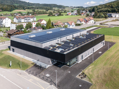 Der Minergie-zertifizierte Neubau überzeugt auch hinsichtlich der Nachhaltigkeit und Energieeffizienz: Auf dem Nebenbau Flachdach sowie an der Ost-, Süd- und Westfassade sind Photovoltaikmodule montiert. Diese liefern Strom für den Eigenbedarf. Auf dem Hallendach hat die EW-Oftringen AG eine Photovoltaikanlage für die Stromproduktion realisiert. Geheizt wird das Gebäude mit einer Luft-/Wasser-Wärmepumpe. Die Innenräume überzeugen mit einem angenehmen Raumklima und einer hochwertigen Materialisierung. Der Neubau ist mit einheimischem Rohstoff gebaut und trägt stolz das Label «Schweizer Holz».