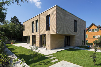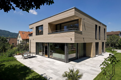 Es ist ein Haus, bei dem irgendwie alles stimmt. Die Grundform des Gebäudes ist schlicht und kubisch, der Eingangsbereich, Fenster und Balkone wurden mit partiellen Aussparungen gestaltet. Ein grosszügiger Wohn-Essbereich mit offener Küchenlandschaft lädt zum Verweilen ein.