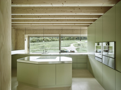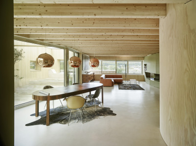 Die architekturaffine Bauherrschaft wohnt in einem exklusiven Einfamilienhaus im Holzsystembau auf Betonstelzen.