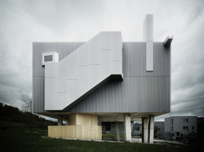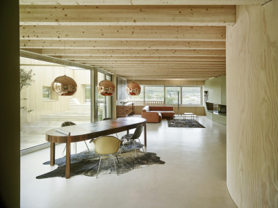 Das aussergewöhnliche Einfamilienhaus steht auf Betonstelzen, damit die Bauherrschaft die beste Aussicht auf Olten und die umliegenden Wälder geniessen kann. Das ist auch der Grund, weshalb sich die Wohnräume und das Atrium im Obergeschoss befinden. Aussen dominieren Fensterbänder und die Metallfassade, sowie skulpturähnliche Elemente, wie die auskragende Treppe und der grosse Kamin. Innen hingegen ist das Material Holz dominierend und an Wänden wie Decken sichtbar.