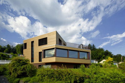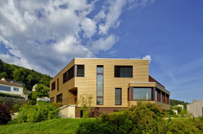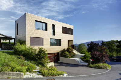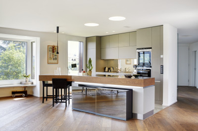 Die Bauherrschaft und der Renggli-Architekt haben sich intensiv mit dem Grundstück auseinander gesetzt, was bereits die Ausrichtung des Einfamilienhauses wiederspiegelt: Das an einer Kurve am Hang gebaute Haus gibt die Aussicht in den Norden ins Luzerner Seebecken frei. Die gebogene Form des Hauses ähnelt einer Brioche. Die Sonnenstunden am Nachmittag können im von der Quartierstrasse abgeschirmten Garten im Innenhof genossen werden. Damit die Aussicht im Wohnraum gewährleistet ist, wurde ein Erker mit nur einer Stütze erstellt - eine grosse Herausforderung an unseren technischen Projektleiter, der die Statik der tragenden Decke sicherstellen musste. Die Küche ist eine Massanfertigung vom Schreiner. Die Pläne dafür hatte der Renggli-Architekt geliefert.