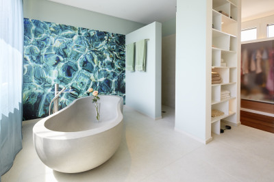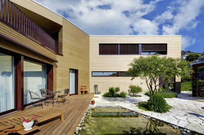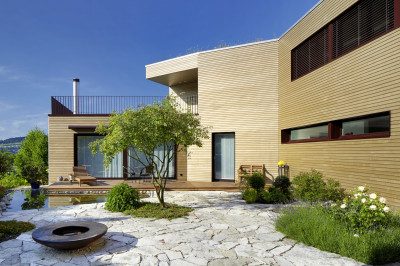 Die vielfältigen und edlen Baumaterialien, die Gebäudeform und der mediterrane Garten geben ein stimmungsvolles neues Zuhause.