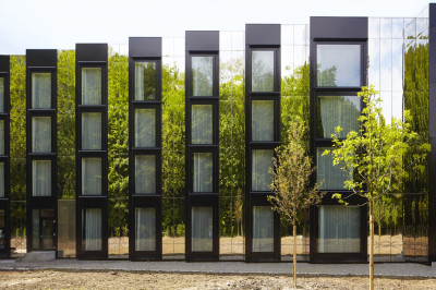 Die Chromstahlplatten des Entwurfs von EM2N Architekten umhüllen die Gebäudekonstruktion aus vorgefertigten Holzelementen. Die Gebäudehülle erfüllt damit höchste Ansprüche in Bezug auf Wärme- und Schalldämmung. Eine wichtige Vorgabe für den Bau des Hotels war ein sehr enger Terminplan. Die Bauzeit betrug abhängig von Wetter und Baufortschritt im Idealfall etwa zehn Monate. Das hatte Konsequenzen für die Materialisierung und die Gebäudestruktur: Betonbauarbeiten beschränkten sich auf eine Bodenplatte und vertikale Erschliessungskerne. Zudem gibt es kein volles Untergeschoss. Der Hauptteil des Gebäudes besteht aus vorgefertigten Holzelementen.
