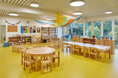 Trotz der Eile am Bedarf für neue Kindergartenräume blickte man zuerst in die statistischen Bücher der Gemeinde und erkannte, dass die Zahl der Kindergartenschüler auch in den kommenden Jahren steigen wird. Innert nur 15 Wochen wurde der Doppelkindergarten im 2014 gebaut. In der Planung wurde dabei bereits die spätere Aufstockung berücksichtigt: Die Statik sowie sämtliche Installationen/Leitungen wurden für insgesamt vier Kindergärten ausgelegt und entsprechend vorbereitet. Im 2020 erfolgte dann innert 18 Wochen die Erweiterung um zwei Kindergärten im Obergeschoss. Seither verfügt die Schule Aarburg im «Paradiesli» über vier Kindergärten mit jeweils einer Kindergartenstube, Gruppenraum, Arbeitsraum, Garderobe, WC und einem Nebenraum bzw. Lagerräumlichkeiten.
