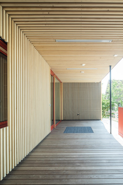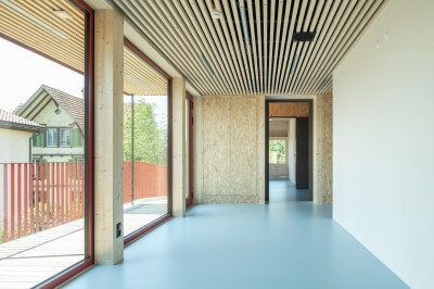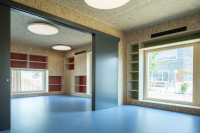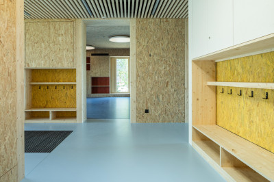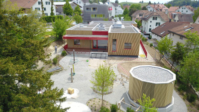 Der Grundriss der eingeschossigen Kinderkrippe ist aufgeteilt: In einen flexiblen und als Rundlauf organisieren Gemeinschaftsbereich sowie in drei abgeschlossenen Zonen für Spielen, Schlafen und Arbeiten (Büro). Der Aussenbereich ist grosszügig und bietet entsprechend viele Spielmöglichkeiten. Der im Aussenbereich angesiedelte Gerätepavillon wurde vollumfänglich - von der Planung über Produktion zur Montage - von Lernenden bei der Renggli AG realisiert.