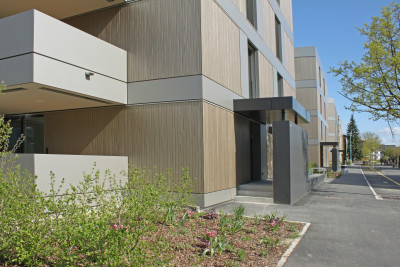 Charakteristisch für die drei Gebäude ist die elegante Fassade aus einer vertikalen Holzschalung und einer horizontalen Metallverkleidung bei Boden-, Decken- und Dachübergängen. Grosszügige Fenster und zwei Balkone pro Etage unterbrechen die Fassade. Bezeichnend sind die asymmetrisch verlaufenden Grundlinien und die zwei Gebäudeteile, die sich schräg ineinander verkeilen. So können die natürlichen Lichtverhältnisse optimal genutzt werden.