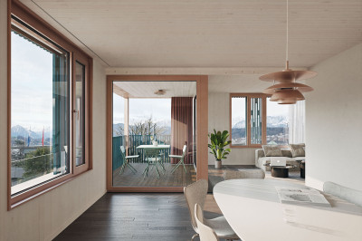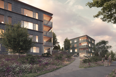 Die gesetzlichen Vorgaben limitieren die Nutzfläche und Gebäudehöhe. Daher hat das Architektenteam eine Holzkonstruktion mit möglichst geringen Aussenwand- und Deckenstärken vorgeschlagen. Die zwei Mehrfamilienhäuser haben sie, passend zur Konstruktionswahl und im Gegensatz zur verputzten Villa, pavillonartig entworfen. Die kompakte, einfache Grundform korrespondiert mit der verspielten, durchscheinenden Fassade. Das architektonische Konzept passt zur ausserordentlichen Lage mit fantastischer Aussicht über die Stadt Luzern. Es gibt den Wohnbauten eine edle Ausstrahlung. Die Holzsystembauten beinhalten je sieben hochwertige Mietwohnungen à 2.5 bis 3.5-Zimmer.