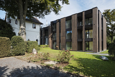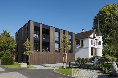 Das dreiteilige Mehrfamilienhaus in Holzbau und Hybridbau beinhaltet Eigentums- und Mietwohnungen.