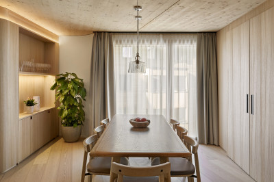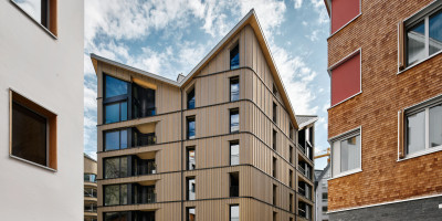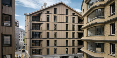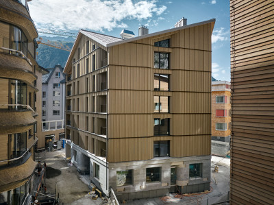 Die Ladenflächen im Erdgeschoss werden ergänzt mit Gemeinschaftseinrichtungen wie Spa, Fitness und Entspannungsraum, welche durch die Bewohner:innen genutzt werden können. Darüber liegen 18 luxuriöse Eigentumswohnungen mit einem hohen und stilvollen Ausbaustandard. Davon wurden vier Penthouse-Wohnungen als Maisonette-Wohnungen konzipiert, welche in gewissen Räumen die doppelte Raumhöhe aufweisen. Die hinterlüftete Holzfassade aus Fichtentäfer sowie abgerundete Fassadenecken und runde Fensterverbreiterungen geben dem Gebäude einen ganz besonderen Charme.