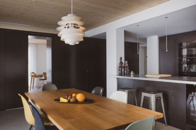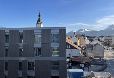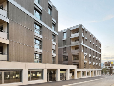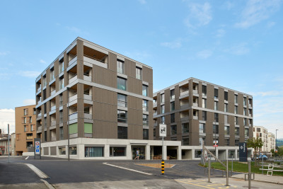 Aufgrund eines Geschäftsumzugs wurde die Bauparzelle frei für eine Überbauung von drei Mehrfamilienhäusern, verbunden mit einem gemeinsamen Erdgeschoss. Im Zentrum von Bulle entstanden so Gewerbeflächen, Büroräume, ein Ärztezentrum, 40 Miet- und Eigentumswohnungen sowie eine Tiefgarage. Die Gebäude sind in Holzsystembau ausgeführt. Auch an der Fassade ist das natürliche Material sichtbar, zusammen mit teils thermolakierten Aluminiumplatten.