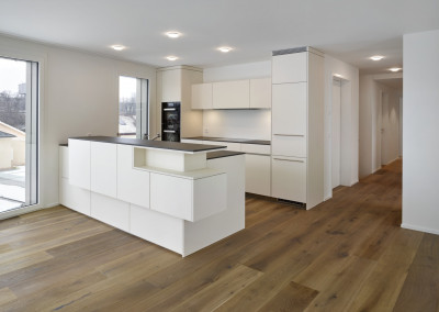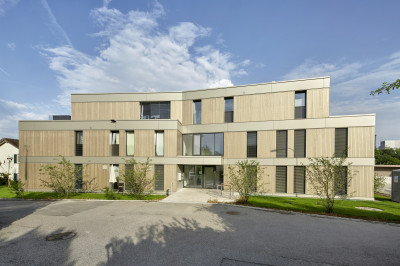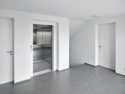 Das dreigeschossige Mehrfamilienhaus verfügt über einen Liftschacht aus Holz. Gemäss der Brandschutzvorschriften 2015 wurde das tragende Holz der Erschliessungszonen mit Gipsfaserplatten abgekapselt. Die Vorteile des Holzbaus kommen dabei voll zum Tragen: der Liftschacht wurde in nur zwei Stunden komplett montiert und erreicht, weil er von der restlichen Struktur abgekoppelt ist, einen besseren Schallschutz.