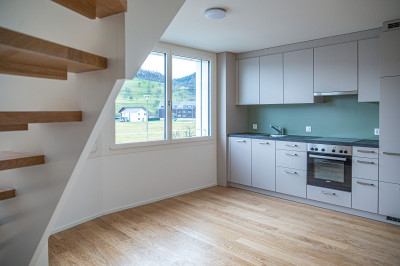 Diese energieeffizienten Eigentumswohnungen sind perfekt für Paare, deren Kinder ausgezogen sind, und die nun gemeinsam in eine neue Lebensphase hineinwachsen wollen - gemäss dem Motto «Mit‘änand». Das abgeknickte Gebäude bietet zwei verschiedene Wohnungstypologien pro Geschoss, welche sich bestmöglich an den Sonnenverlauf und deren Einstrahlung orientieren. Die Gemeinschaftsräume befinden sich zentral im Knick des Bauvolumens. Zum Raumprogramm gehören ebenfalls eine Werkstatt, ein Fitnessraum, eine Studiowohnung - optional für Pflegepersonal - sowie ein gemeinsamer Nutzgarten.