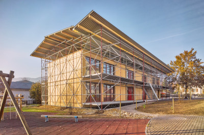 Das auffällige Baugerüst dient der vertikalen Erschliessung. Es bietet gleichzeitig gedeckten Aussenraum auf jedem Geschoss, damit die Lehrpersonen die Schülerinnen und Schüler im Freien unterrichten können. Zur Sturzsicherung wurde ein Sicherheitsnetz montiert, an dem sich bald der Efeu empor angelt. Das fliegende Dach spendet im Sommer Schatten und schützt die Fassade und Lüftungsmonoblocks vor der Witterung. Speziell ist zudem der Liftkern, der ebenfalls in Holz ausgeführt wurde.