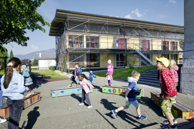 Die mögliche zukünftige Erweiterung um zwei Geschosse, hohe Aussenraumqualitäten und ein hervorragendes Kosten-Nutzenverhältnis waren die Parameter, die zum unkonventionellen Entwurf dieser modularen Schulraumerweiterung in Bellach geführt haben.