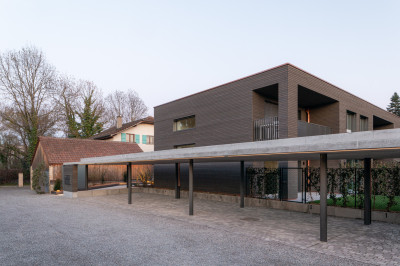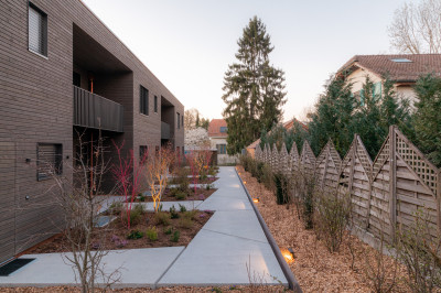 Auf dem Grundstück von ca. 1’000 m² stand vorher ein Einfamilienhaus, das dafür abgerissen wurde. Dies entspricht voll und ganz der Politik zur Verdichtung des Wohnraums durch den Kanton Genf. Dank einer Holzkonstruktion mit vorgefertigten Elementen konnte die Bauzeit für den Rohbau verkürzt werden, was auch die Beeinträchtigung der Nachbarschaft mit Lärmemissionen verringerte.