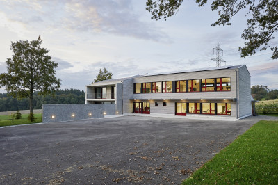 Nach der CCEM-Methode wurde eine neue Gebäudehülle mit vorfabrizierten Fenstern montiert. Die Holzfassadenelemente in leichtem Grauton kontrastieren mit den roten Fensterrahmen. Die Hauswartswohnung hat neu einen ausgebauten Keller mit Tiefgarage. Neu sind auch der vergrösserte Balkon und die grosszügige Terrasse. Im Schulhaus wurden die Bodenbeläge erneuert und eine Cafeteria eingebaut. Die Räume für die Erwachsenenbildung und die Hauswartswohnung werden mit einer Erdsonde geheizt anstatt mit der alten Ölheizung, die Photovoltaikanlage auf dem Dach generiert Strom.