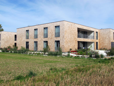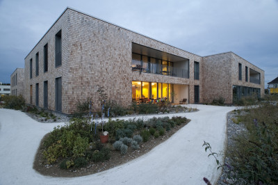 Eine versetzte Anordnung der Wohngruppen gliedert das Bauvolumen und schafft attraktive Aussenräume. Die naturbelassenen Holzschindeln der Fassade verleihen dem Gebäude eine feinsinnige Erscheinung. Die Farbgestaltung nach dem Konzept des Künstlers Jean Pfaff schafft im Innern Individualität und hilft den Bewohnern bei der Orientierung.