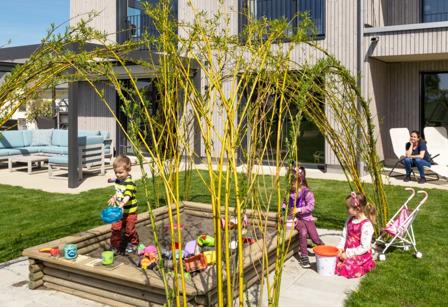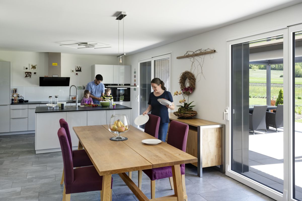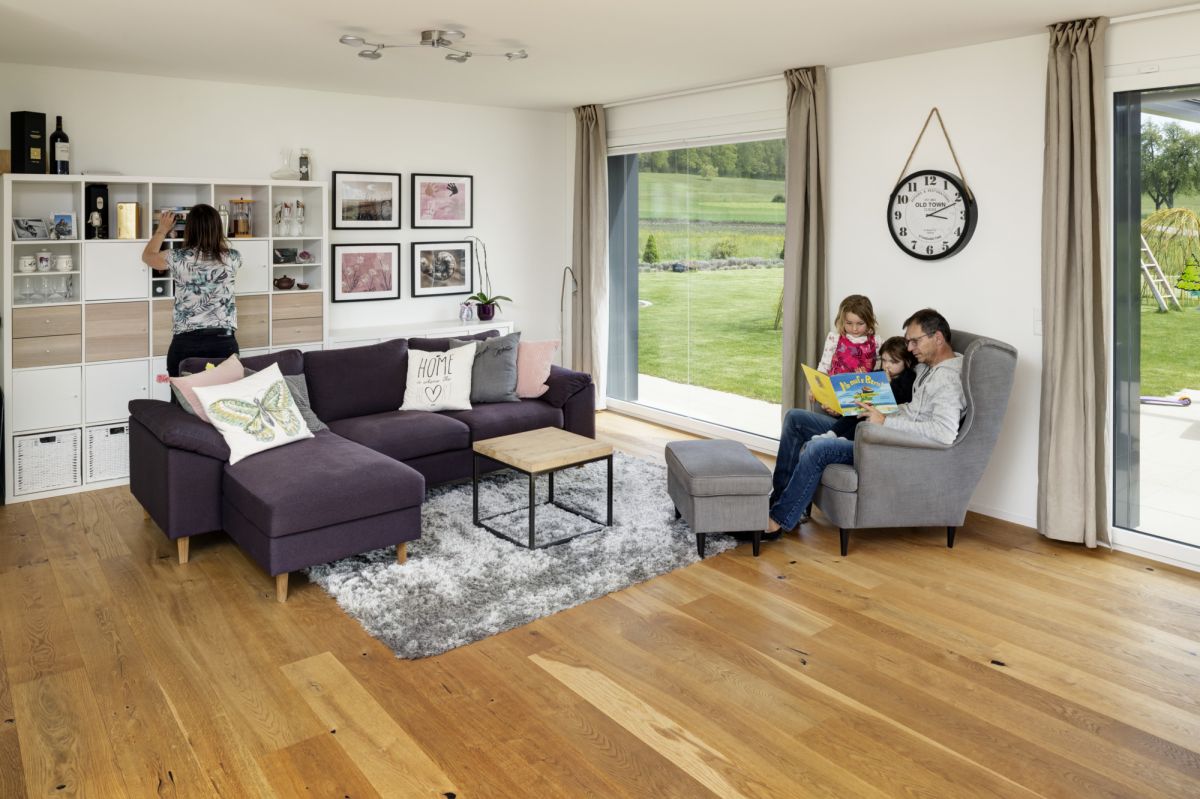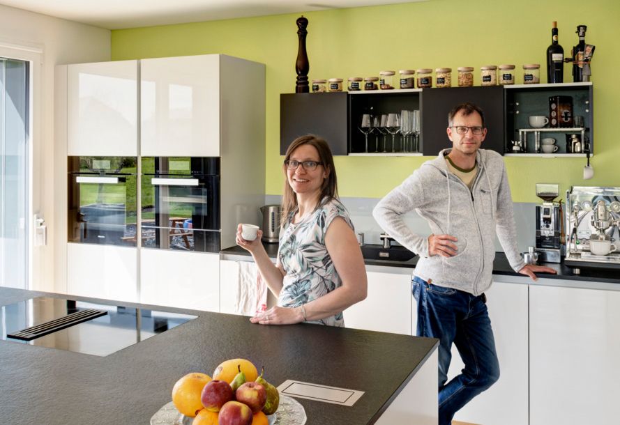 Annoncé sur un portail web, le projet a éveillé l'intérêt des familles Wien et Nanz. C'est précisément dans cet esprit de durabilité qu'elles avaient imaginé leur propre projet. Les parties 1 et 2 du bâtiment ont donc été vendues avec la possibilité d’exprimer des souhaits personnels. Maggie Friedrich a emménagé dans l’appartement du rez-dechaussée de la partie 3 de l’immeuble où elle profite de la superbe vue qu’offre le salon baigné de lumière sur la nature environnante et les montagnes. Le premier étage est destiné à la location mais l’appartement n'est pas occupé pour le moment. Cette forme de vie qui réunit dans deux maisons individuelles et un appartement des personnes jeunes et une plus âgée fonctionne à merveille. Cela est certainement dû en partie au fait que Setz Architektur AG a aménagé très intelligemment les espaces extérieurs en tenant compte de la sphère privée des uns et des autres. Matthias Nanz trouve que la vie en compagnie de ses voisins est harmonieuse. Elle permet à chacun de jouir de toute l’intimité voulue sans toutefois se sentir seul. La garde mutuelle des enfants et les repas pris en commun rendent la situation très agréable.