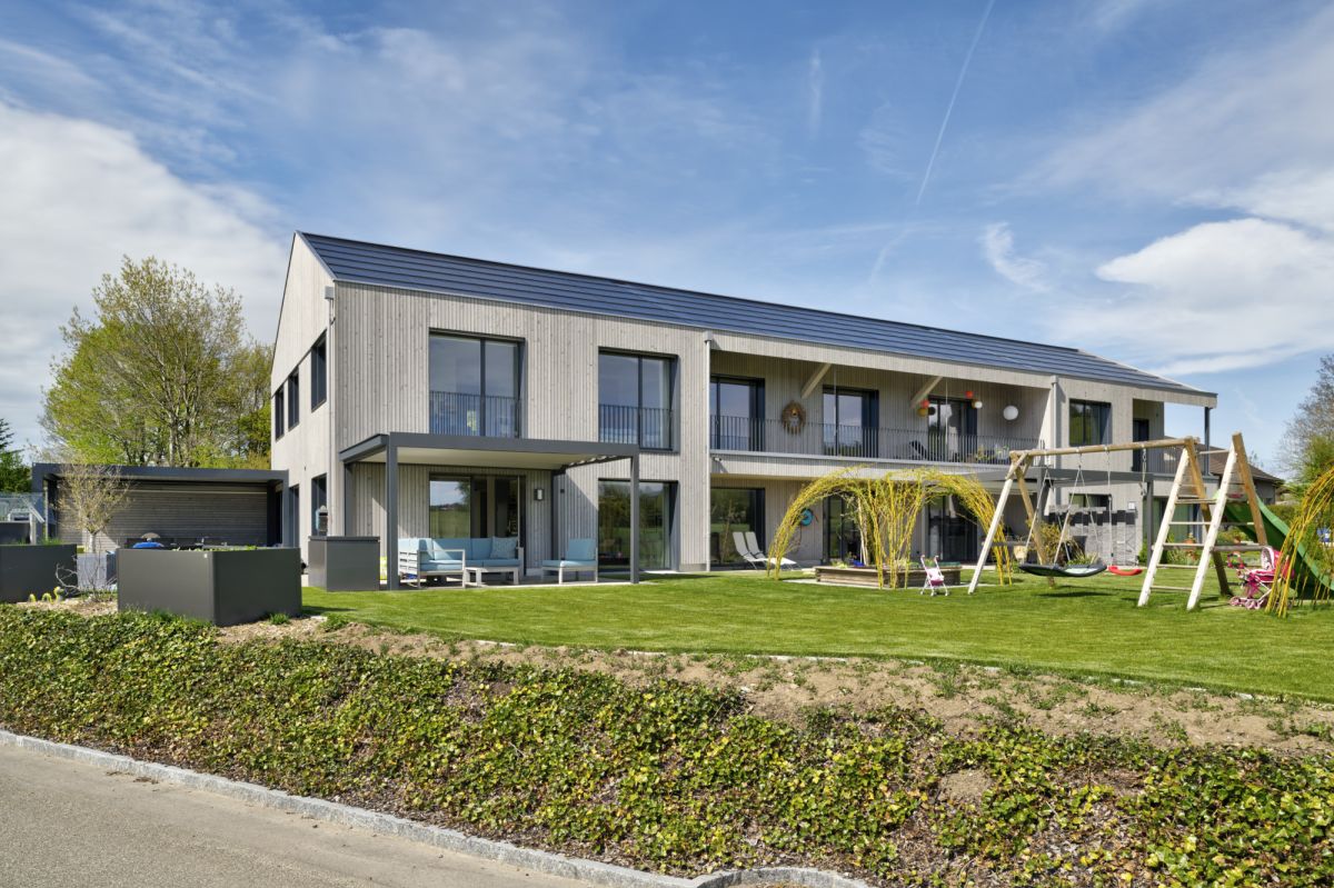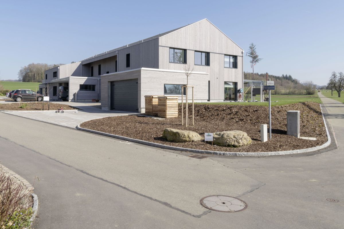 Setz Architektur AG a conçu un bâtiment EnergiePlus en bois local pour Maggie Friedrich avec une isolation durable en laine minérale, une aération douce, un système de récupération de chaleur et une pompe à chaleur géothermique à énergie solaire, ce qui a permis d’atteindre le standard de construction Minergie-P selon lequel une maison produit plus d'énergie qu'elle n'en consomme. Pour des raisons liées à l'aménagement du territoire, l’histoire ne s’est pas arrêtée à la maison prévue dans un coin de la parcelle. En fin de compte, le volume de la construction a facilement représenté le triple. Une chance pour les Wien et les Nanz. Ces deux familles liées d’amitié s’intéressaient aussi à l’époque à un projet de construction. Leurs maisons devaient également répondre à des exigences écologiques élevées, comme celle de madame Friedrich. Elles étaient à la recherche d’un terrain susceptible de leur convenir mais ne le trouvaient pas.
