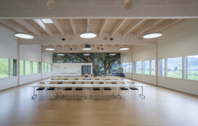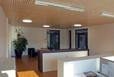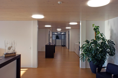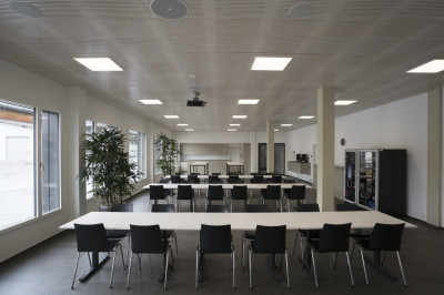 L’immeuble de quatre étages conçu avec un système de construction bois porte la signature de Renggli SA, de la conception au montage en passant par les prestations d’ingénierie. Il comporte l’installation sprinkler des halls de production (au sous-sol), un grand restaurant d’entreprise, deux étages de bureaux, des salles de réunions et un attique avec une salle audiovisuelle dont la hauteur sous plafond de 5.40 mètres est deux fois supérieure à celle des autres étages. Elle peut accueillir jusqu’à 200 personnes. Un plafond acoustique réalisé avec notre centre de fabrication de panneaux (BAZ) crée une atmosphère harmonieuse dans les locaux grâce à une bonne isolation.