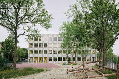 Toutes les fonctions sont réunies dans un seul bâtiment : le rez-de-chaussée comprend un vaste hall d’entrée avec une cour couverte pour les récréations. Le jardin d’enfants s’installera dans l’aile sud du rez-de-chaussée et bénéficiera d’un espace extérieur dédié. La salle de sport sera partiellement enterrée d’un étage, tout en profitant d’un éclairage naturel provenant de l’est. Les salles de classe et la garderie se trouvent aux étages supérieurs. Au dernier étage se trouvent des espaces publics comme la salle de chant et la cantine, complétés par une grande terrasse sur le toit, utilisable de manière polyvalente.