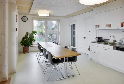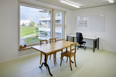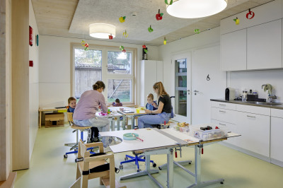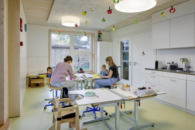 L’étage supérieur a d’abord été laissé à l’état de gros œuvre car on ne savait pas encore à quoi il servirait. Après l'inauguration du jardin d'enfants, l’idée de ne pas utiliser la surface disponible pour un autre jardin d’enfants mais pour une classe supérieure de l'école primaire spéciale (enfants et adolescents ayant divers handicaps, notamment physiques) s’est imposée. Grâce à la flexibilité modulaire, l’espace a pu être aisément adapté aux besoins relatifs à l’enseignement avec, en outre, une salle de réunion et un bureau pour la communication de soutien (équipé d’ordinateurs spéciaux, de tablettes avec pictogrammes etc.). Le financement du projet de construction a été assuré par Impact Immobilien AG, comme cela avait déjà été le cas pour le bâtiment résidentiel d’Aarhus.