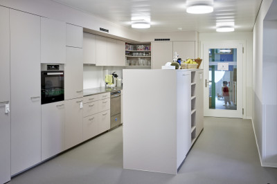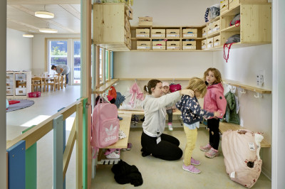 Le nouveau bâtiment de deux étages, adapté aux enfants, accueillera bientôt trois groupes de crèche. Il dispose de vestiaires, d'une salle de repos, de salles de bain, d'une cuisine et d'un bureau. À l'étage supérieur se trouvent des salles polyvalentes pour les activités physiques et le bricolage ainsi que des locaux pour le personnel. La moitié des locaux au premier étage sera louée. Les locaux techniques et de stockage ainsi que deux salles de loisirs pour une utilisation tierce se trouvent au sous-sol. Les petits devraient particulièrement apprécier les sols de jeu dans les salles de groupe, sur lesquels ils peuvent jouer en toute sécurité avec des lattes de bois colorées ou un filet.