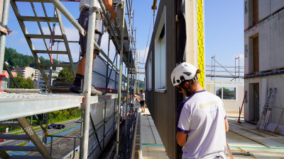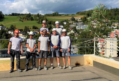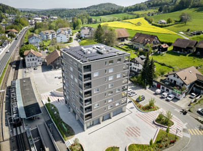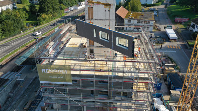 Un immeuble commercial et résidentiel de huit étages a été réalisé selon le mode de construction bois à Rudolfstetten, à côté de la gare, dans le nouveau centre en pleine croissance du village.