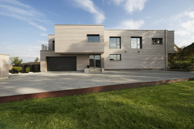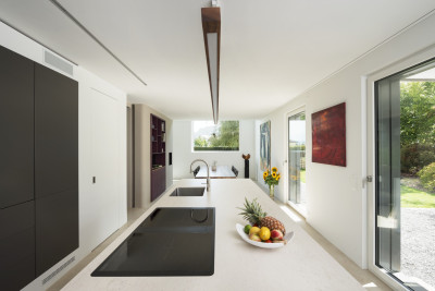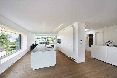 La villa a été démolie et le sous-sol entièrement conservé. La nouvelle construction en forme de L présente un espace sophistiqué sur deux étages. Au rez-de-chaussée, se trouve un appartement de 4.5 pièces avec jardin, à l’étage un loft de 3.5 pièces. Avec 5.5 pièces, la partie duplex des maîtres d’ouvrage, constitue la plus grande unité d’habitation, sur deux étages.
