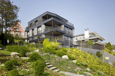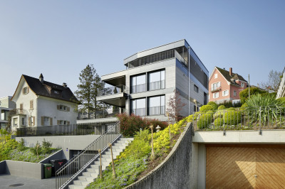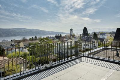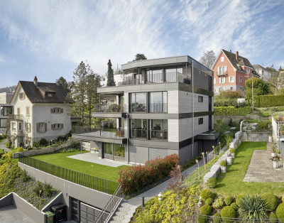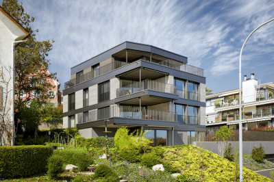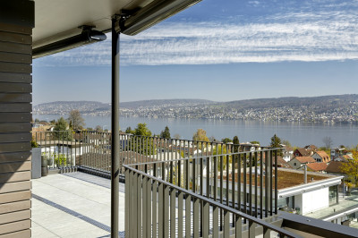 Le nouveau bâtiment allie esthétique attrayante, efficacité énergétique, intimité et la rentabilité dans l'esprit du client. Chacun des quatre spacieux appartements à louer bénéficie d'une vue magnifique sur le lac de Zurich, grâce à un volume simple, un plan d'étage optimisé, de grandes surfaces vitrées et la disposition arrière de la cage d'escalier et de l'ascenseur. De magnifiques parquets, des cuisines équipées exclusives, des armoires encastrées modernes et des salles de bains élégantes offrent un très haut niveau de finition pour ces appartements en location avec le système de façade métallique brillant.
