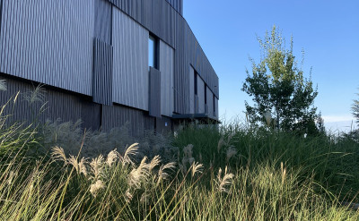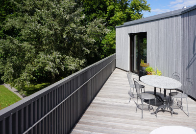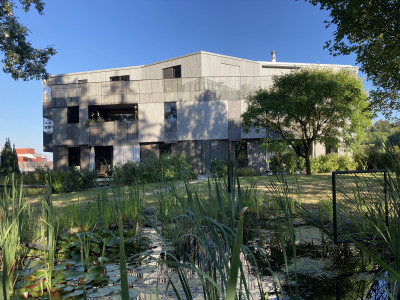 L'«Arche» qu'ils ont conçue s'intège dans le paysage, grâce à sa géométrie horizontale et relie l'espace naturel extérieur avec le bâtiment. Le calepinage de la façade recrée l'environnement naturel avec les arbres existants du parc. L'attique - en quelque sorte le pont - est inséré harmonieusement au-dessus des loggias latérales.