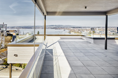 L’immeuble de cinq étages offre 5 appartements de location avec une vue magnifique sur le lac de Zoug, le panorama des montagnes et le soleil couchant.