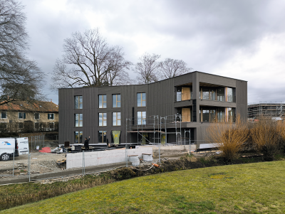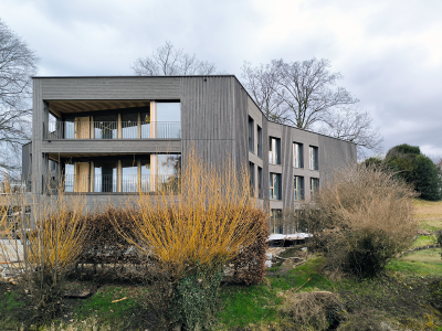 Les deux bâtiments s'intègrent harmonieusement dans le terrain existant - l'un à la limite nord de la parcelle, l'autre à la hauteur de la maison de maître existante. La préservation des vieux arbres et de la bande boisée naturelle a été un élément central de la planification.