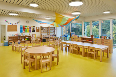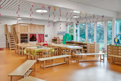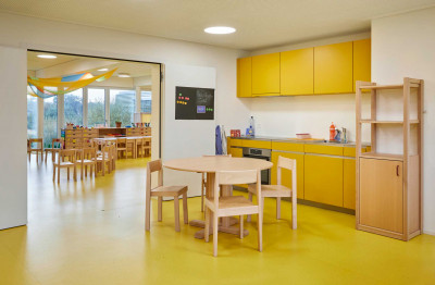 Malgré l’urgent besoin de nouveaux locaux destinés aux enfants, la commune a d’abord procédé à un examen statistique et reconnu que le nombre d’élèves d’école maternelle augmenterait dans les années à venir. Le double jardin d’enfants a été construit en à peine quinze semaines en 2014. Une future surélévation a été prise en considération dans la phase de planification. La statique ainsi que toutes les installations et conduites ont été prévues pour quatre jardins d’enfants et conçues en ce sens. Les travaux d’agrandissement ont été effectués en l’espace de dix-huit semaines en 2020. Deux jardins d’enfants ont été créés au premier étage. L’école d’Aarburg «Paradiesli» dispose désormais de quatre jardins d’enfants avec, pour chacun d’entre eux, une salle d’école maternelle, une salle commune, un espace de travail, un vestiaire, des toilettes et une pièce annexe pouvant servir de local de rangement.