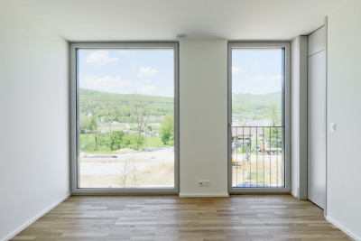 Dans le projet Bornfeld, les bâtiments sont reliés par groupes de trois par une cour. Les maisons jumelles et individuelles groupées se composent de trois étages complets. Seul l'étage inférieur est construit en dur.