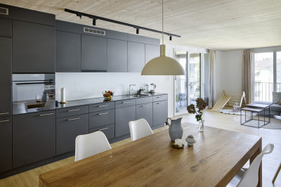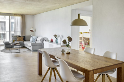 Sous la direction de Rhomberg Bau AG, avec Timbatec, TS3 et Renggli comme partenaires, cela a néanmoins été possible: en effet, les éléments de plafond TS3 en bois peuvent être collés au niveau des joints et posés sur des poteaux. Aucune poutre n’est donc nécessaire. Sans modifier les détails, il a ainsi été possible de transformer des constructions hybrides en constructions en bois. Grâce à une analyse approfondie de la part de Rhomberg Bau AG, il a en outre été possible d’identifier des mesures rentables et donc de respecter le cadre budgétaire imposé pour l’ensemble du projet.