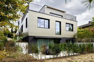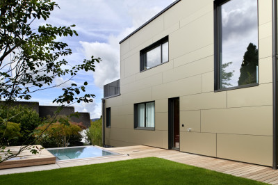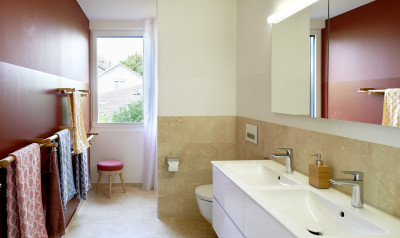 Les souhaits des maîtres d’ouvrage, exprimés avec clarté et professionnalisme, ont facilité la communication avec Philipp Cescato, l’architecte de Renggli. C’est devenu un luxueux bâtiment hors du commun de forme cubique et moderne. Le père de la mâitre d’ouvrage, René Bregenzer a apporté sa contribution. Il a en effet participé au développement du système de façade Alucobond. L’utiliser était une façon de lui rendre hommage. Les pièces du dernier étage permettent de jouir de la vue au-delà des maisons voisines. Les enfants aiment par-dessus toutes leurs chambres de l’étage intermédiaire et l’appartement indépendant qui se trouve tout en bas fait le bonheur d’un couple locataire.
