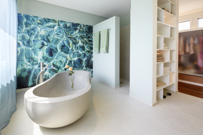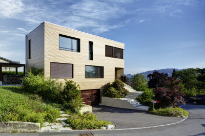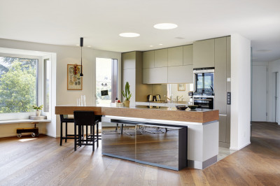 Les maîtres d'ouvrage et l'architecte de Renggli ont soigneusement étudié la configuration du terrain. La façon dont la maison est placée reflète leur travail de réflexion. Le bâtiment construit dans un virage, sur une pente, offre au nord une vue sur le lac de Lucerne. Sa forme arrondie rappelle celle d'une brioche. On peut profiter des heures ensoleillées de l'après-midi dans le jardin situé à l'écart de la rue dans la cour intérieure. Afin que la vue dont on jouit du salon soit dégagée, une partie en saillie a été conçue avec un seul pilier. Un grand défi relevé par le responsable technique de Renggli qui a dû garantir la stabilité du plafond portant. La cuisine a été réalisée sur mesure par un ébéniste. Les plans ont été fournis par l'architecte de Renggli.