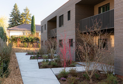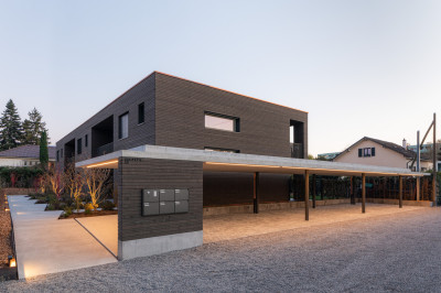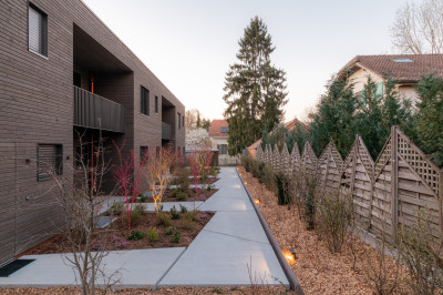 Sur la parcelle d’environ 1’000 m² se situait avant une maison familiale et qui a été démolit. Cela rentre tout à fait dans la politique de densification des logements du canton de Genève. Grâce à une construction en bois avec des éléments préfabriqués, le temps de construction du gros-œuvre a pu être réduit, ce qui a également permis de diminuer les nuisances pour le voisinage.