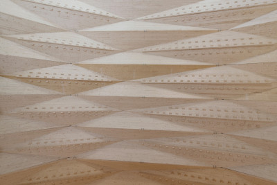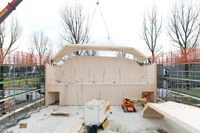 La stabilité de cette construction en bois d’une envergure de plus de 20 mètres est assurée sans appui et même sans clous ni vis. Une première. Le bâtiment rappelle les origamis japonais qui tiennent debout uniquement par un jeu de plis, sans aucun moyen de fixation. Cette oeuvre d’art a pu voir le jour grâce à une collaboration entre l’entreprise construction bois Blumer-Lehmann SA et le laboratoire de recherche IBOIS de l’Ecole polytechnique fédérale de Lausanne (EPFL) située à proximité.