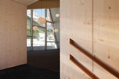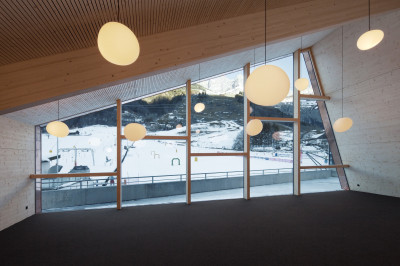 Les parents peuvent maintenant regarder leurs enfants descendre la piste pour débutants de la terrasse ou du restaurant qui compte 170 places à l’intérieur et 150 à l’extérieur. L’étage du restaurant est entièrement en bois (épicéa), matériau aussi très présent dans l’aménagement intérieur. Un plafond acoustique réalisé dans l’usine de Renggli a été installé pour réduire les émissions sonores. Le restaurant dispose de deux salles à manger. La cuisine se trouve au milieu. Il y a également un salon fait pour la détente.