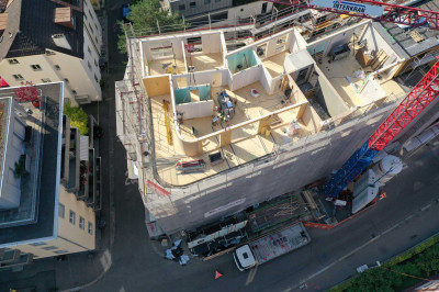 Dans le quartier populaire de «Seefeld», un bâtiment des années 30 a été entièrement rénové et surélevé selon un système de construction bois. L’étage ajouté comprend quatre appartements. Compte tenu de son faible poids, le bois permet une telle surélévation et présente encore d’autres avantages: une courte durée de construction sur site et des émissions réduites. Dans le cadre du projet de la Münchhaldenstrasse, le montage du nouvel étage a pu être effectué en l’espace d’un mois. Les locataires pourront bénéficier dès le mois de mai 2021 d’un climat intérieur sain dans cette ville animée.